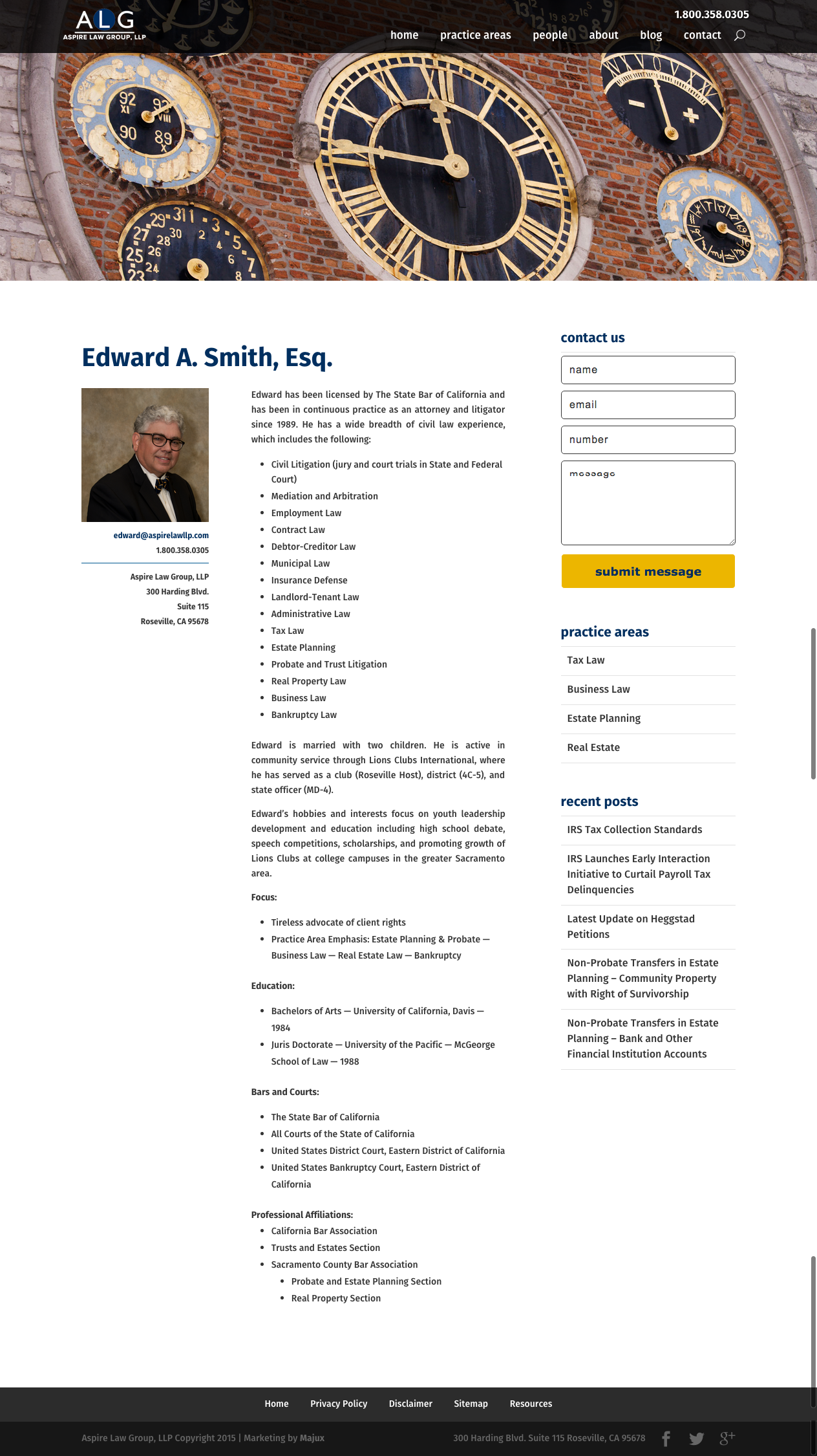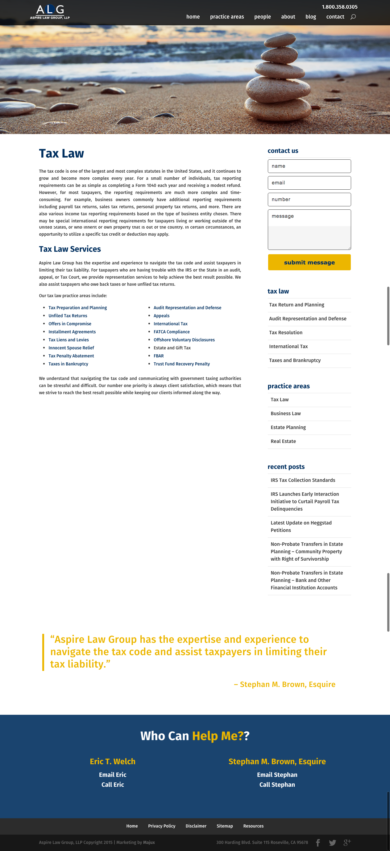 By carefully selecting a wide range of high quality images, I was able to create a visually impressive design that still allows visitors to find the information and contacts they need quickly and easily. The website runs off of WordPress and features full mobile, tablet, and desktop responsive views in addition to a custom Javascript practice areas page.
